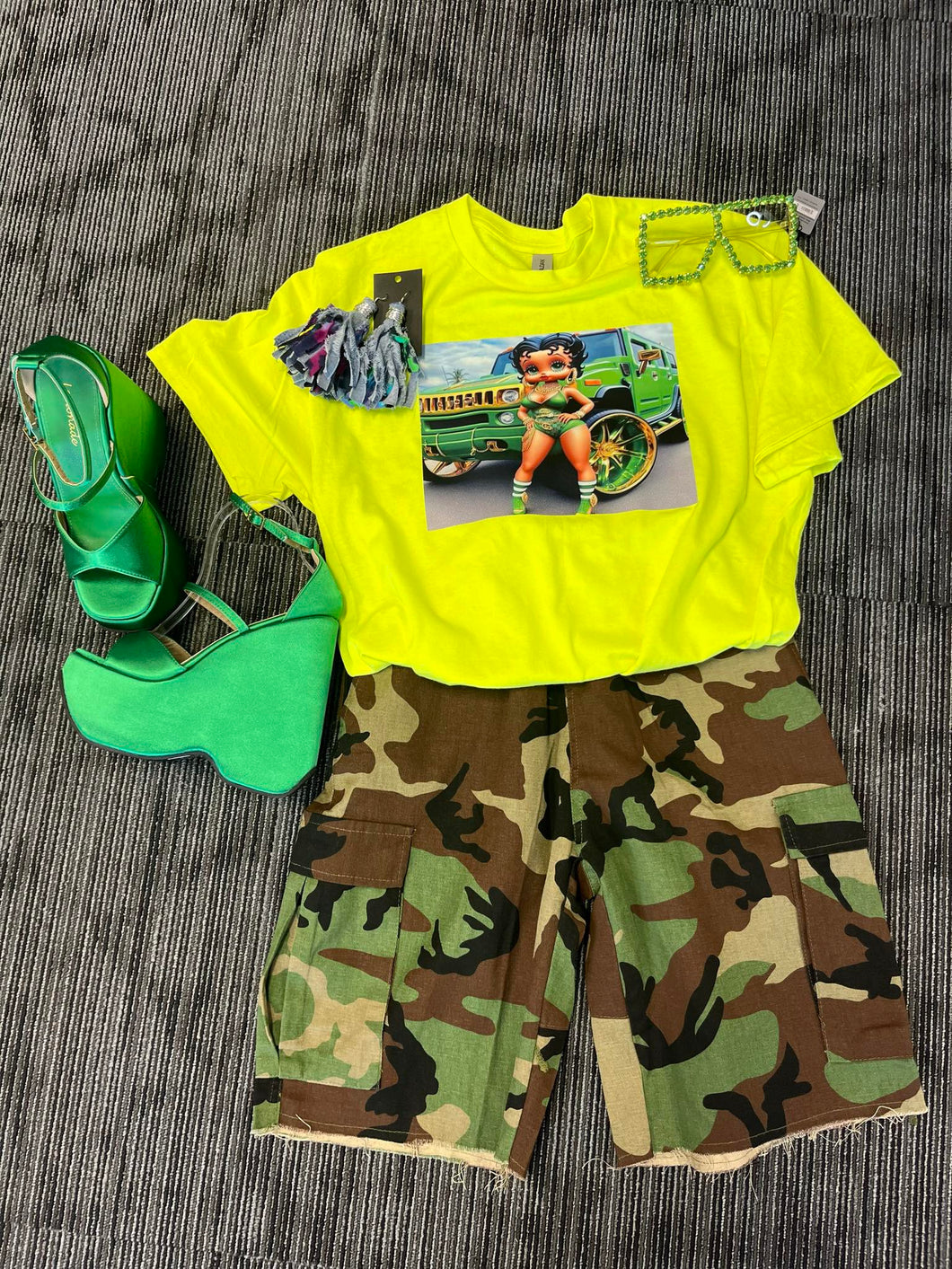 Stay on trend and make a statement with our "Green With Envy" T-shirt. This unisex T-shirt, inspired by the iconic Betty Boop, features a vibrant neon yellow color. Perfect for standing out in a crowd and showing off your unique sense of style.