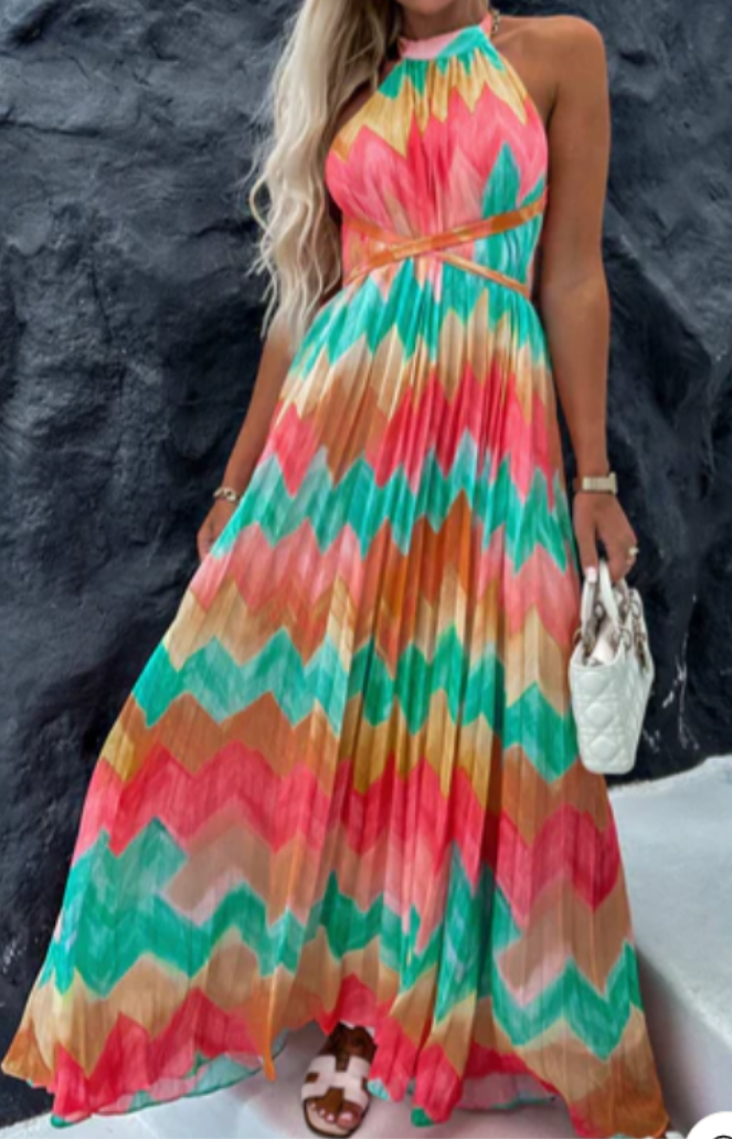 This "Breeze" plus size maxi dress is a staple for any warm weather wardrobe. Its versatile halter design and pleated detailing make it both stylish and comfortable. Plus, it runs true to size and features a perfect Spring/Summer color combination. You can't go wrong with this must-have dress.